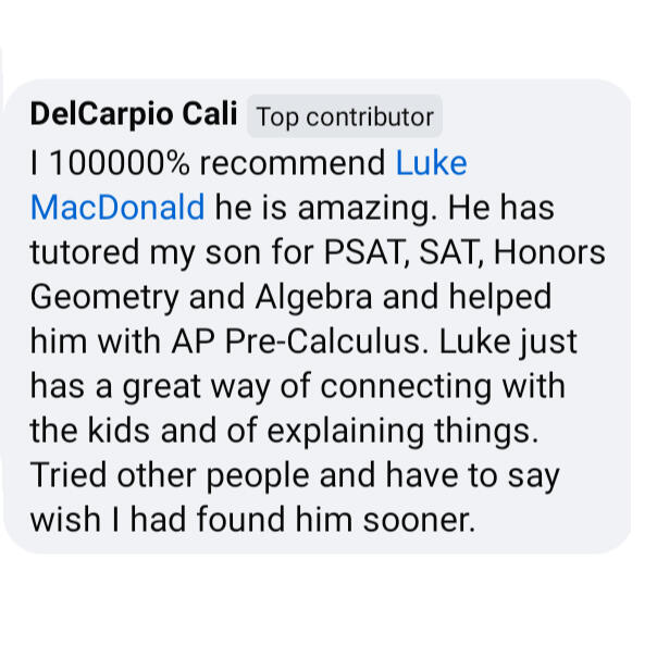 My name is Luke MacDonald. I tutor all sections of the SAT and ACT in addition to middle/high school math and English - online and in person (in western Michigan).I've worked for multiple tutoring companies and have helped dozens of students raise their scores since 2019.I offer comprehensive tutoring at reasonable rates and work with students of all abilities.